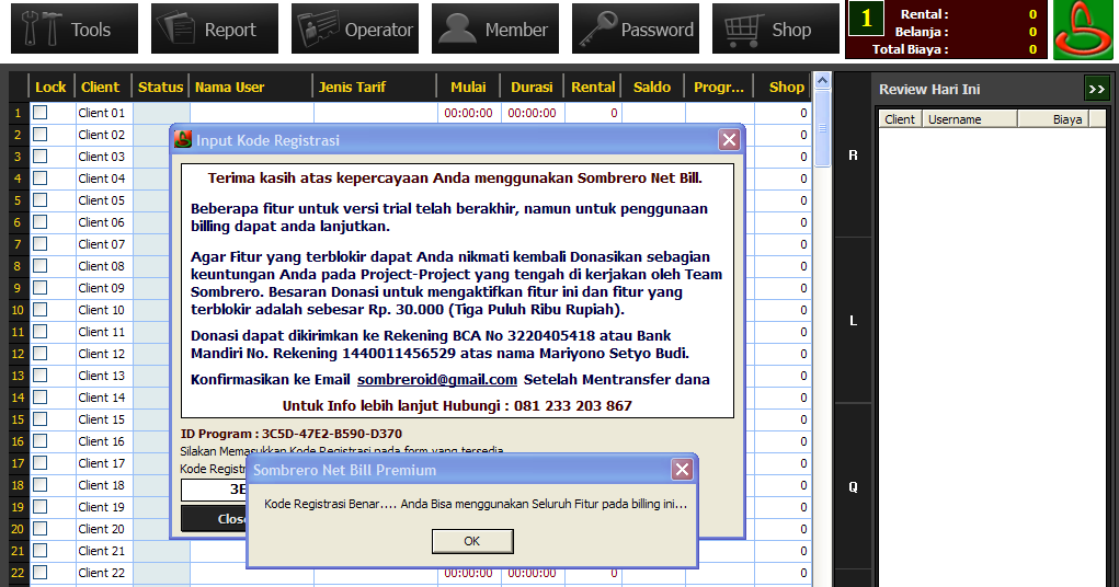 Billing Warnet Gratis Sombrero Net Bill Premium - R4 persembahan dari Nadi Corporation adalah kelanjutan dan pengembangan dari seri Sebelumnya yaitu SNB Premium Beta II. Tampilan dan fitur² masih sama dengan SNB Premium versi sebelumnya, namun ada beberapa tambahan perbaikan dan penambahan fitur² baru antara lain: • Tampilan lebih menarik (Standart / Metro Style) • Auto Detect Billing Close + LAN Monitoring • Color Customizing • Multi custom Member • Quick Member/Quick Prepaid • Pemberitahuan suara (MP3 / WAV) • Multi Remote Desktop • Beberapa Perbaikan Bug • dll. Default Username untuk SERVER = Administrator Password = admin Default Username CLIENT = admin Password = admin. Pesan Error saat menjalankan billing: Pesan error yang sering terjadi adalah A. ' No value given for one or more required parameters' Billing ini menggunakan setting 'Regional Option' Indonesia. Jika ingin menghindari pesan error di atas saat menjalankan billing ikuti langkah berikut. Ubah setting Regional and Language Options menjadi Indonesia (Start>>Setting>>Control Panel>>Regional and Language Options ) 2.